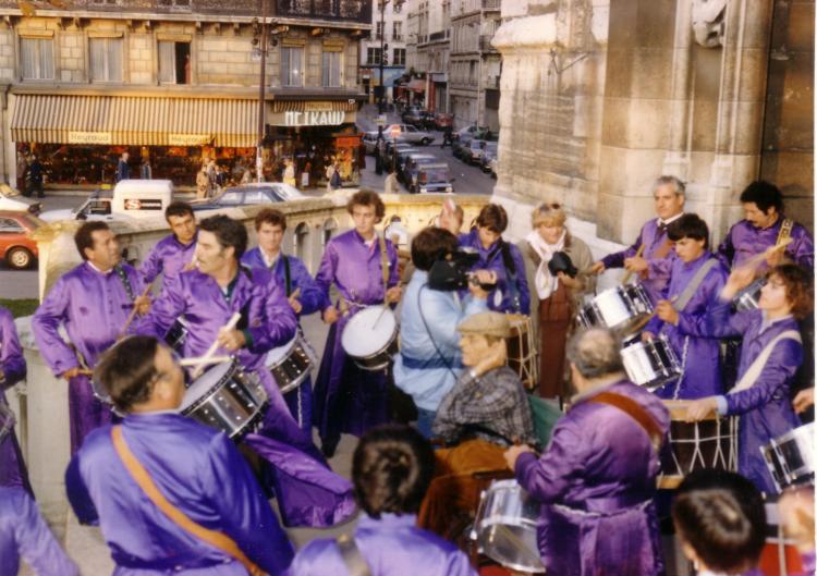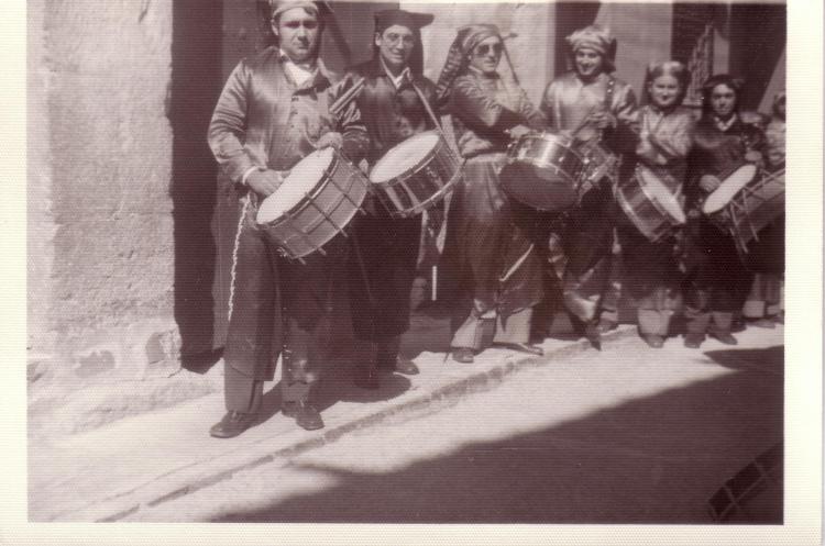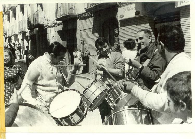 Me viene a la cabeza cuando todas las noches quedábamos para ensayar, algo que venía haciéndose ya muchos años atrás, para formar cuadrilla y poder así participar en el concurso de tambores y bombos que tenía lugar en la localidad vecina de Híjar, que empezó a celebrarse en el año 1965. Para entonces dicho concurso tenía un carácter local, si bien, ante la poca participación durante los dos años primeros años, finalmente se decidió que fuese comarcal.