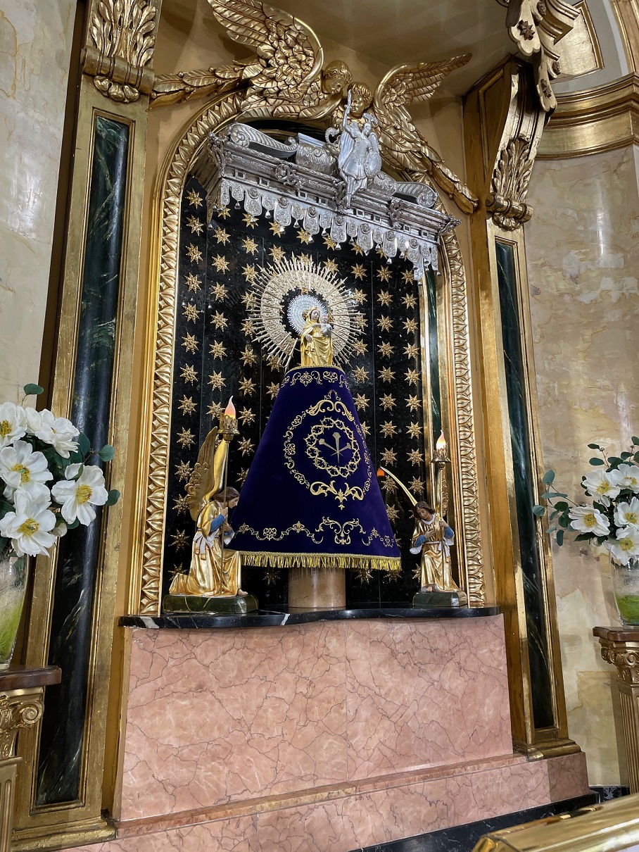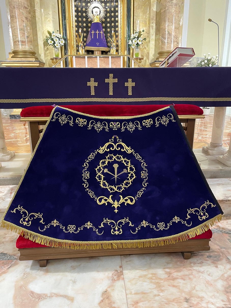 La celebración comenzó en nuestro querido Templo del Pilar, casa de todos los calandinos, la cual estuvo presidida por nuestro párroco Mirko y nuestro anterior sacerdote, Pablo Roda. Como reflejo del amor a la Virgen del Pilar y a nuestra cofradía, asistieron un nutrido grupo de cofrades. Bajo el altar se pudo ver ya colocado el manto a entregar, el cual no podía ser de otro color que el morado, en terciopelo e hilo de oro. El diseño se basa en el escudo de la cofradía y motivos vegetales, un manto fino y elegante, muestra como siempre, de nuestro buen hacer. En su reverso puede leerse la inscripción “La Cofradía de Jesús Nazareno con todo nuestro cariño a nuestra patrona la Virgen del Pilar. 23 de marzo, Semana Santa 2024”.